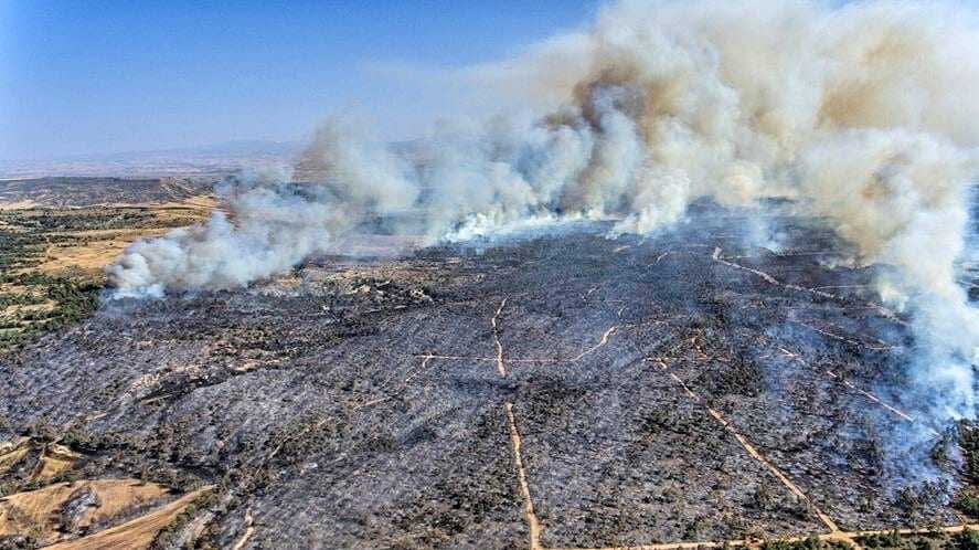 Circa 5,000 ettari (12,400 acri) di terreni agricoli e foreste sono stati distrutti da incendi, che hanno spazzato tutta la parte settentrionale di Cipro domenica scorsa, spazzando via circa il 90% delle regioni 2,000 ulivi monumentali.